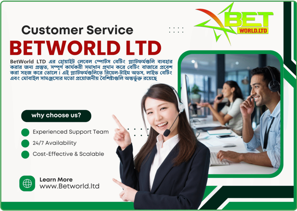 BetWorld LTD হোয়াইট-লেবেল বেটিং প্ল্যাটফর্ম লাইসেন্সিং, ওয়েবসাইট ডেভেলপমেন্ট বা জটিল ইন্টিগ্রেশন ছাড়াই একটি কাস্টমাইজযোগ্য স্পোর্টসবুক প্রদান করে, শীর্ষ-স্তরের বৈশিষ্ট্য এবং ব্র্যান্ড বৃদ্ধির জন্য নিবেদিত সমর্থন প্রদান করে।
